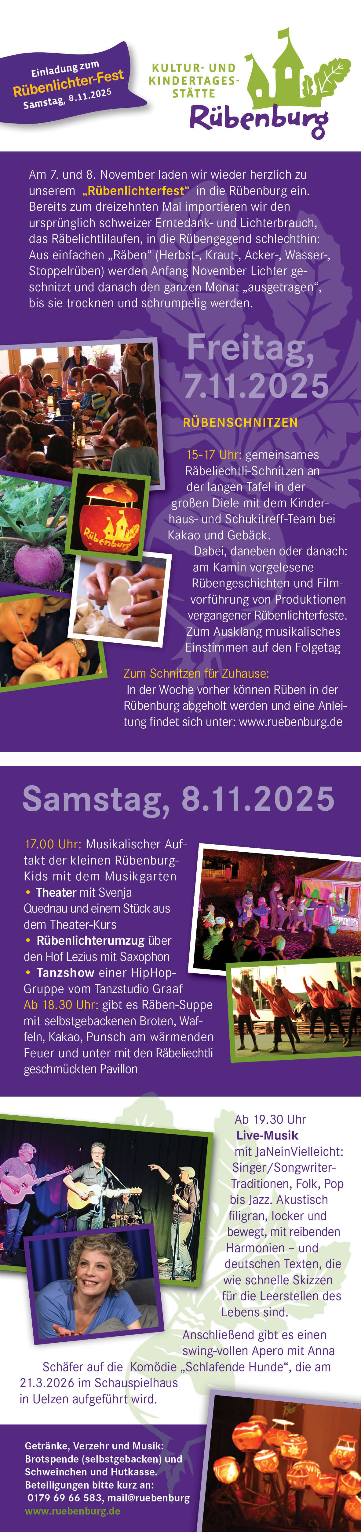 Rübenlichterfest Karte nicht verfügbar Datum/Zeit Date(s) - 08|11|2025 (Sa)15:00 - 22:00 Veranstaltungsort Rübenburg Kategorien Rübenburg